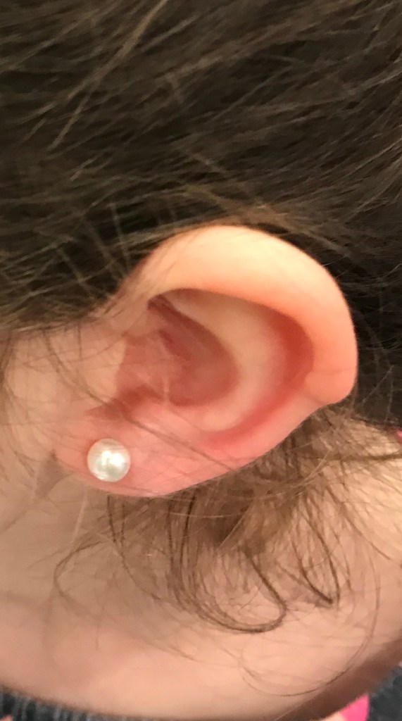 For whatever reason, you decided, you were ready to have your ears pierced. You’ve been asking for three years. It started wistful and moved to determined. You worked hard to show you were responsible enough and disciplined enough to keep them clean and wait for the holes to heal. Here is where the pieces of your Dad come in. You were resolved and steady, like him. I researched. I got suggestions from friends of where they pierced. I had wanted to maybe have them pierced without a gun and at a shop with an experienced tattooist who would know more than the young woman at the local accessory shops. Yet, there was really only one artist who pierced earlobes for kids aged under thirteen and that required a trip to Cambridge. You were impatient. So the weekend after your birthday I took you to the mall to look at earrings, price out the two places that did piercings with guns, and also had a tattoo shop where I could pick someone’s brain about pros and cons, earring choice, and cost. We had agreed we’d come back with Dad the next day and get it done together. However, you had your own plans. We stopped at Claire’s. I was reading the informational sign and browsing the earrings, metals, and shapes– when a mom sat down with a baby– maybe six months old — to get earrings. I asked if you wanted to watch. Honestly, darling, I was hoping you’d chicken out. Yet, watching the baby get pierced, hysterically cry, and have little gold studs made you unmovable. I left a bazillion questions unasked and we just did the dang thing. You, who seem some days like your eyes are actual just leaking faucets, didn’t shed a tear. You told me, “I was too happy to cry even though it hurt.” You have that bravery thing down, kid. You are the master of doing things afraid and it makes me very proud of you. It is a superpower: to feel things so deep and to take actions anyway.